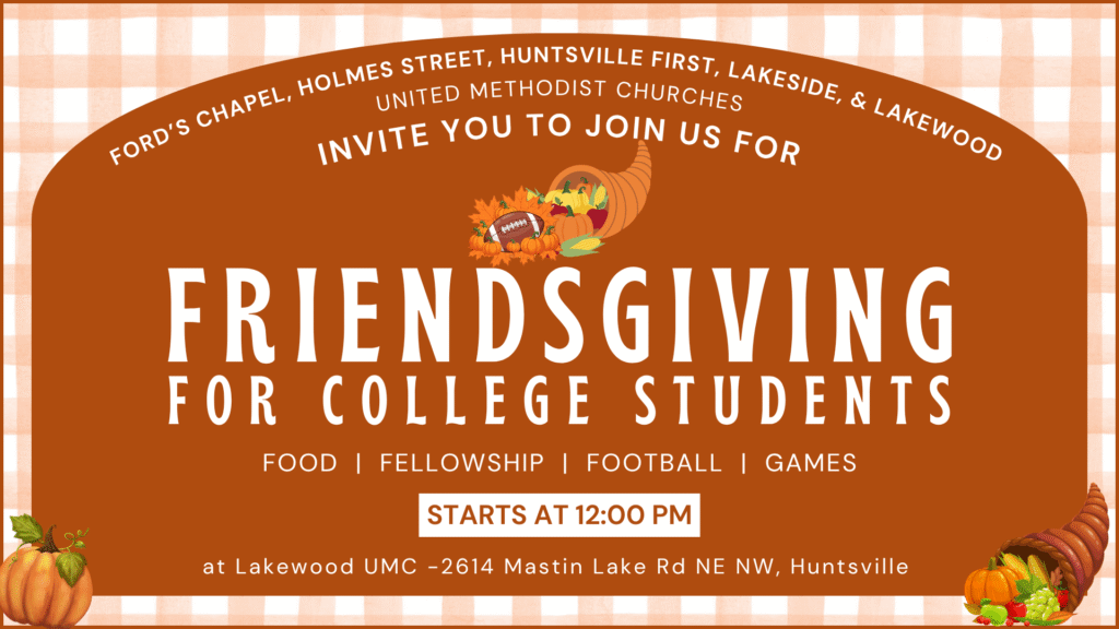 Join members from Ford’s Chapel, Holmes Street, Huntsville First, Lakeside, and Lakewood UMCs in blessing college students from UAH and AAMU with a home-cooked meal on November 29. Come for the meal or just drop off! Thanks to Lakewood UMC for hosting!
