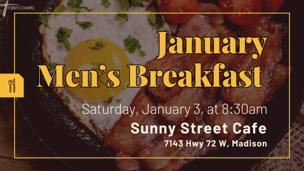 Kick off the new year with good food and great fellowship! The men of Ford’s Chapel will gather for breakfast on Saturday, January 3 at 8:30 a.m. at Sunny Street Café.