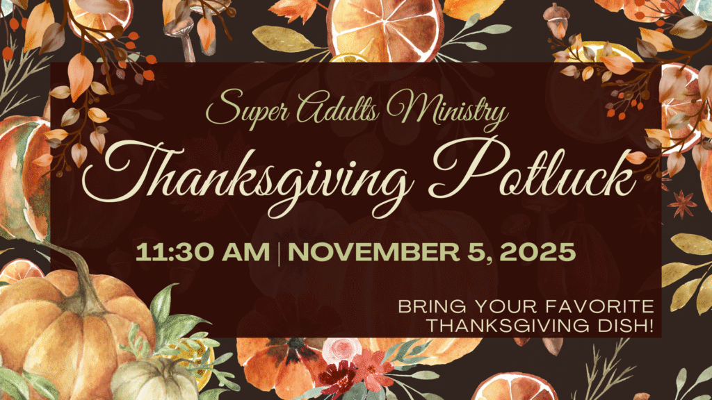 Come celebrate the season of gratitude with the Super Adults Ministry! We’re gathering for a festive Thanksgiving Potluck filled with delicious food, warm fellowship, and joyful reflection.