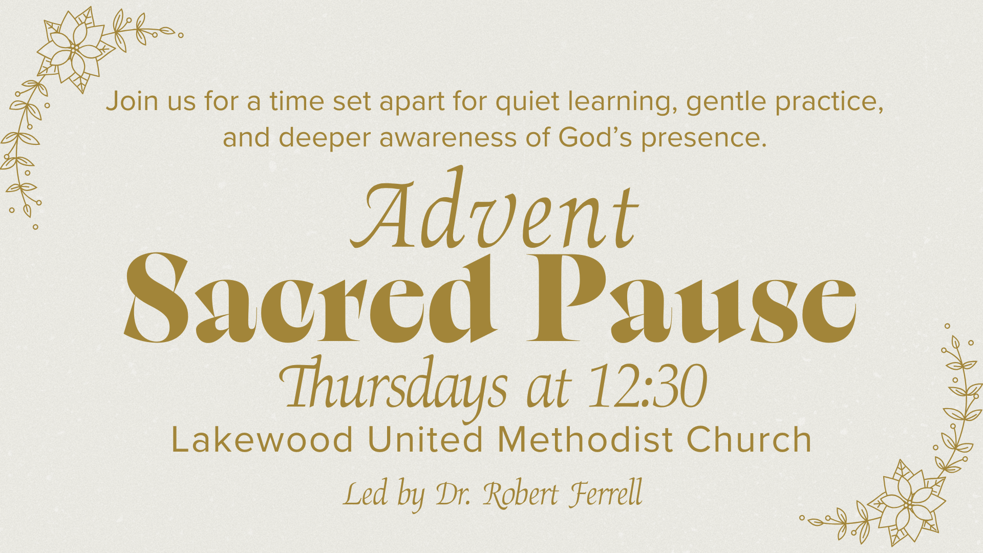 Lakewood United Methodist Church 2614 Mastin Lake Rd NE NW, Huntsville, AlabamaDuring this Advent season, you are invited to a sacred pause each Thursday at 12:30 PM at Lakewood UMC—a time set apart for quiet learning, gentle practice, and deeper awareness of God’s presence. Advent invites us to wait, to listen, and to prepare our hearts. Together we will explore simple ways of resting in God’s...