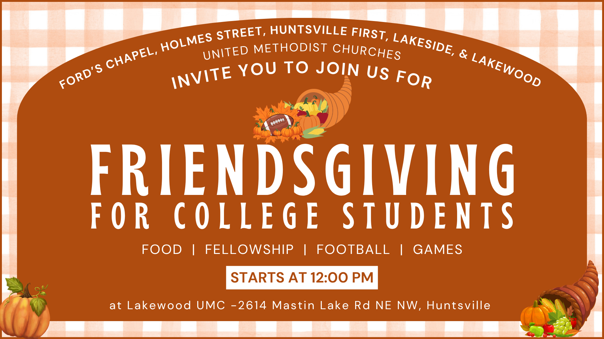 Lakewood United Methodist Church 2614 Mastin Lake Rd NE NW, Huntsville, AlabamaNot every student gets to go home for the holidays—so let’s bring the warmth of home to them! Join us for a cozy, joy-filled Friendsgiving where college students can relax, eat well, and feel loved. Join members from Ford's Chapel, Holmes Street, Huntsville First, Lakeside, and Lakewood UMCs in blessing college students from UAH and...