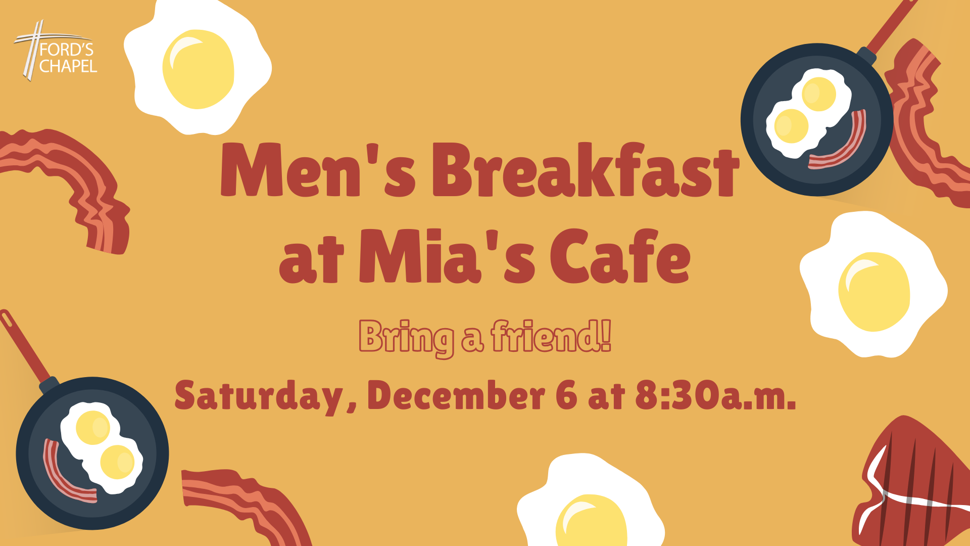 MEN’S BREAKFAST — Meet us at Mia's Cafe in December! Mia's is on the southwest corner of Hwy 72 and County Line Road, in Madison. Join our Men's group for a great breakfast and even better fellowship.