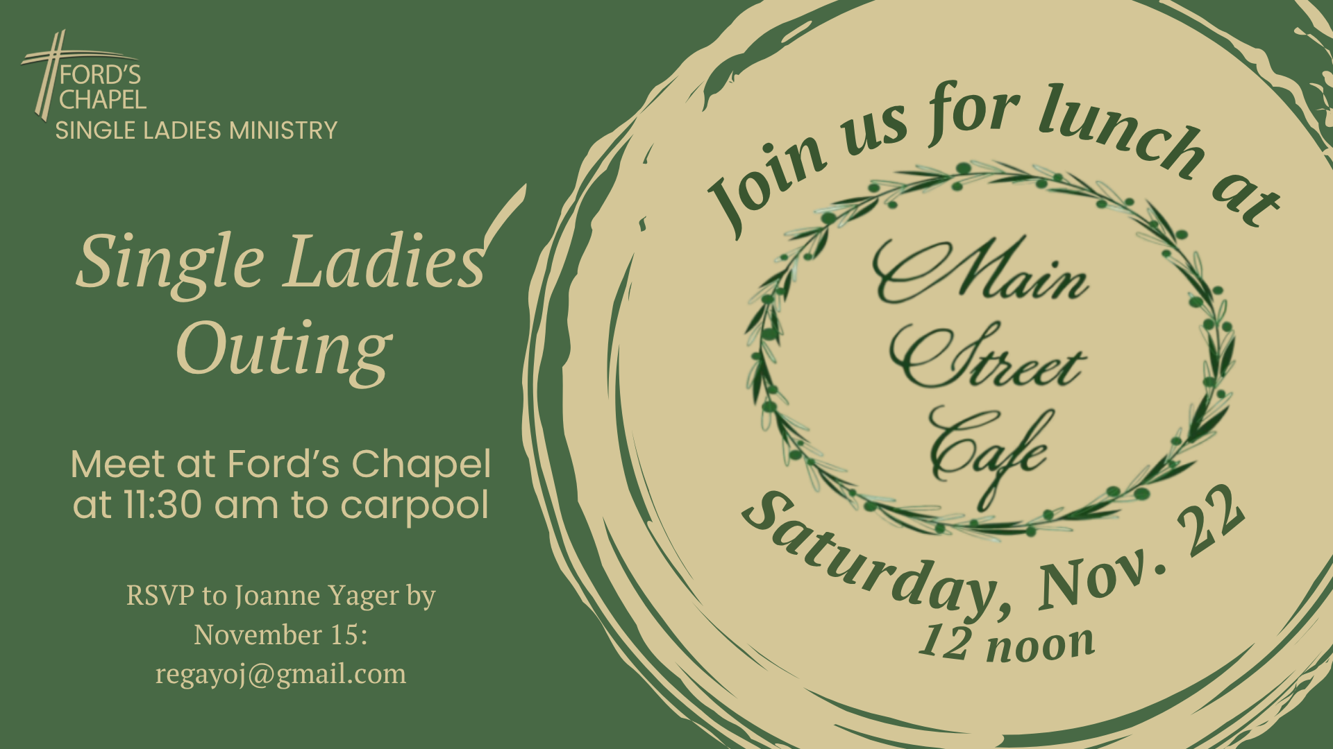 Join us for a fun and friendly lunch at Main Street Cafe! Meet us at the restaurant at 12:00 PM, or gather in the church parking lot at 11:30 AM to carpool. Please RSVP by November 15 to Joanne Yager or contact the church office at office@fordschapel.org. We’d love to see you there!