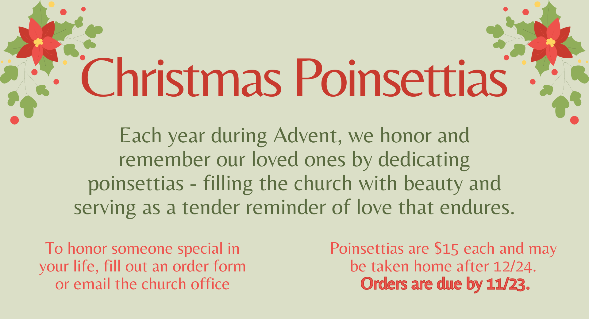 Each year, we honor and remember our loved ones by dedicating poinsettias—symbols of love and remembrance that fill our church with beauty throughout Advent. This year, these meaningful tributes will be placed during our Hanging of the Greens service, as we decorate the sanctuary and prepare our hearts for the coming of Christ. Order forms are available in...